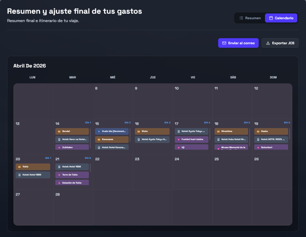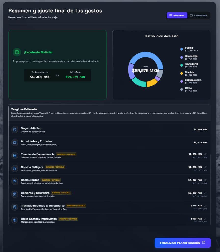 Modifica cada rubro (hoteles, comidas, transporte, dias) para que el plan se adapte exactamente a tu bolsillo.